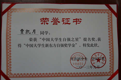 在刚刚揭晓的2012年度“中国大学生自强之星”评选中,正妹av 贾凯月同学从全国9000多名候选人中脱颖而出,荣获2012年度“中国大学生自强之星”提名奖和“中国大学生新东方自强奖学金”。这是近几年来我校唯一一名获此殊荣的学生。