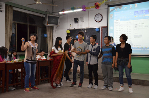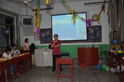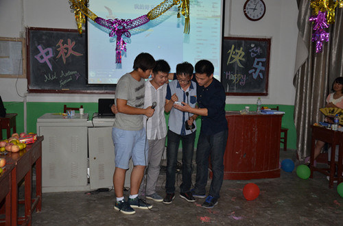 9月19日晚,正妹av 2013级新生在各班教室举办了中秋晚会。党总支副书记兼2013级辅导员王慕东、团总支书记王建阳、辅导员李春玲与学生会主席团成员到各班与同学们欢庆中秋。