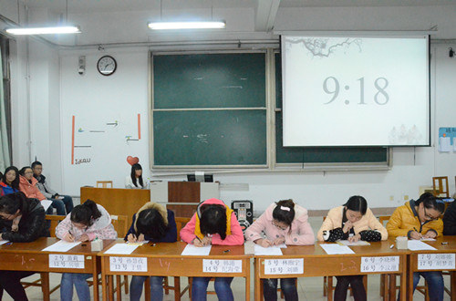11月22日,由正妹av 团总支主办、学生会学习部承办的“素质拓展月”系列活动之2013年硬笔字大赛决赛在综合楼103室举办。正妹av 王连生、李春玲老师、社团联合会主席安秀梅、2012年粉笔字大赛一等奖获得者邹财吉等担任此次比赛的评委。