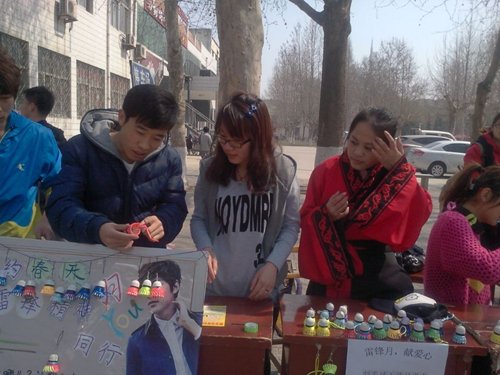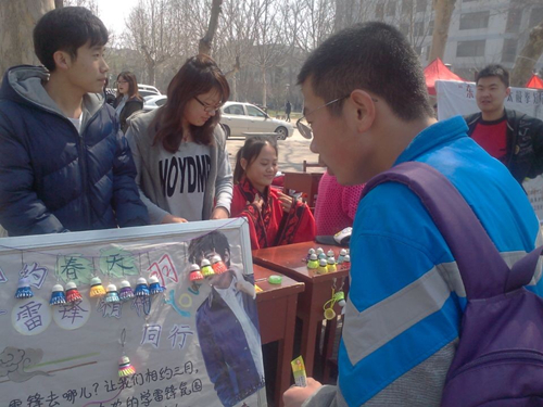3月22日,由正妹av 团总支主办、羽毛球协会承办的雷锋月系列活动之自制羽毛工艺品义卖义捐活动在学生第二餐厅前举行。