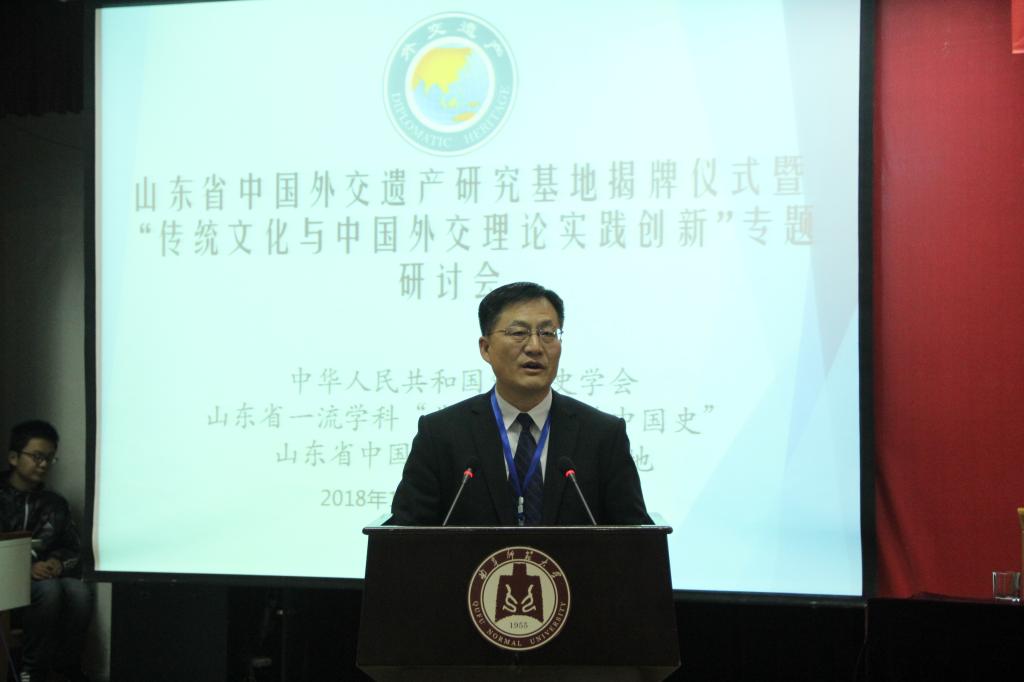 开幕式上,我校特聘教授、山东省中国外交遗产研究基地执行主任王在邦对山东省中国外交遗产研究基地的情况作了介绍,山东省社会科学规划管理办公室副主任李冰兵和我校党委副书记马善军共同为“山东省中国外交遗产研究基地”揭牌。