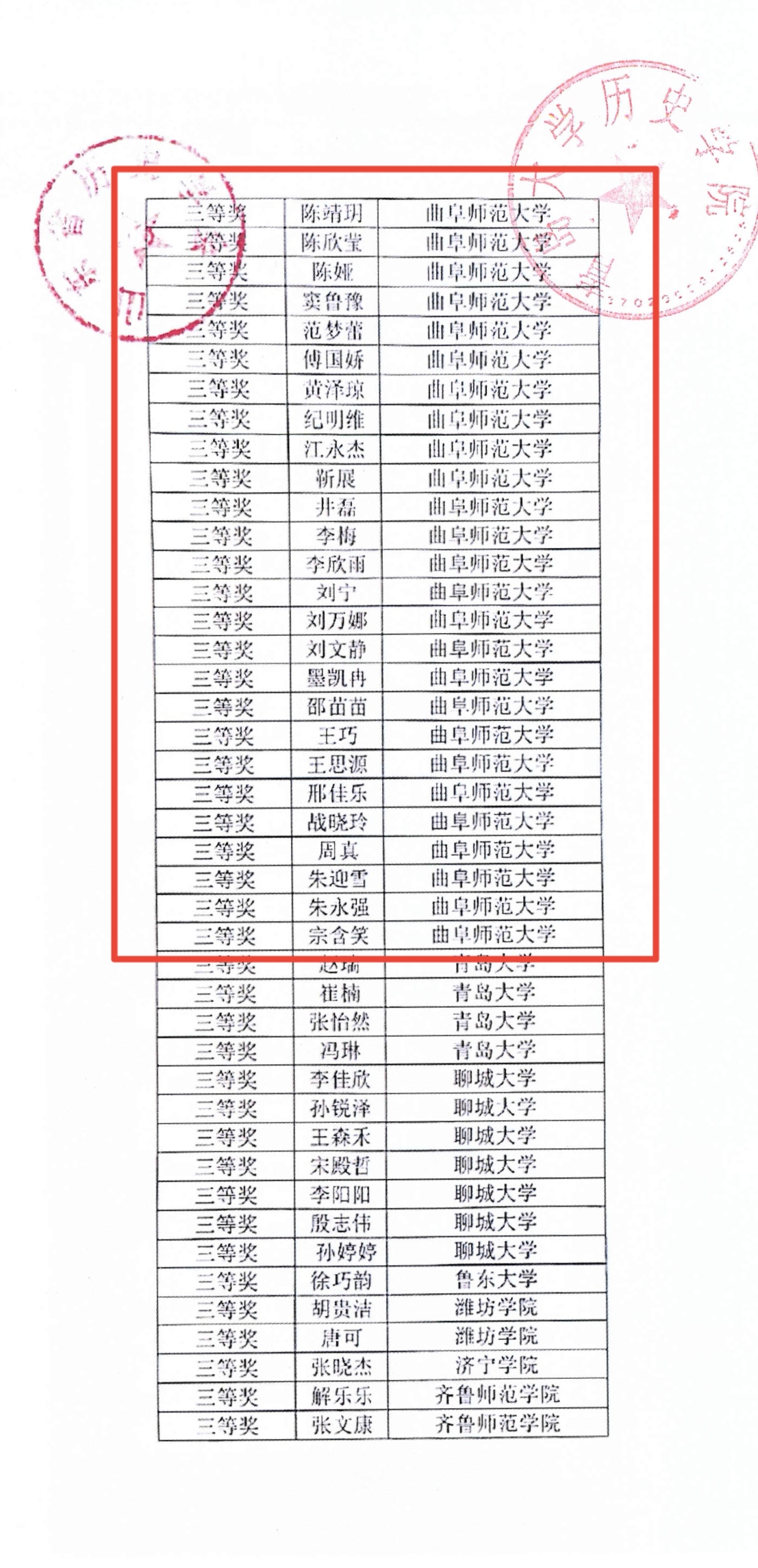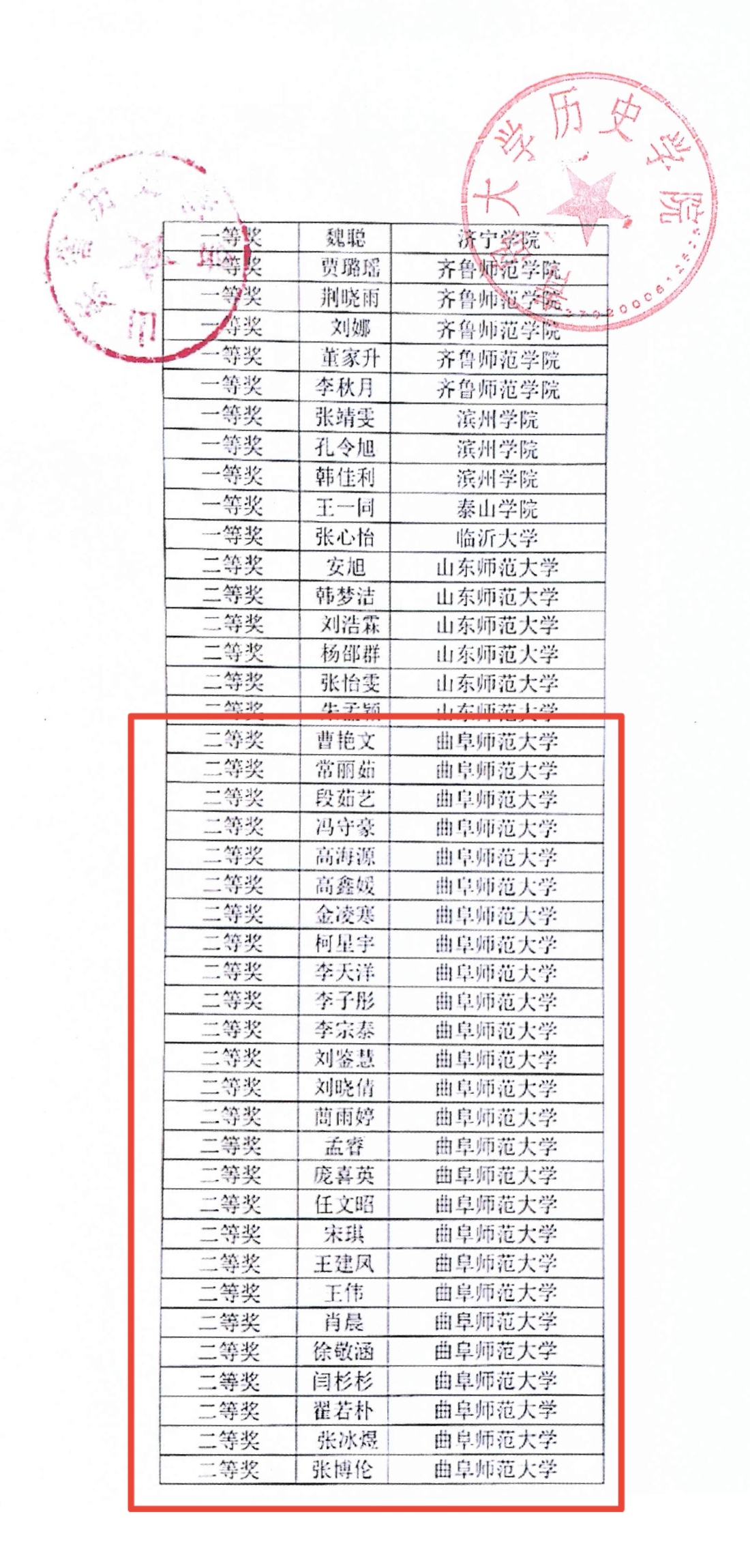 近日,第二届山东省大学生历史征文大赛圆满落下帷幕,正妹av 学子积极参加并在大赛中荣获佳绩。其中,正妹av 文岱婧同学荣获特等奖,洪钱玉等二十一位同学荣获一等奖,曹艳文等三十一位同学荣获二等奖,曹聪等三十位同学荣获三等奖,窦志越等十七位同学荣获优秀奖。