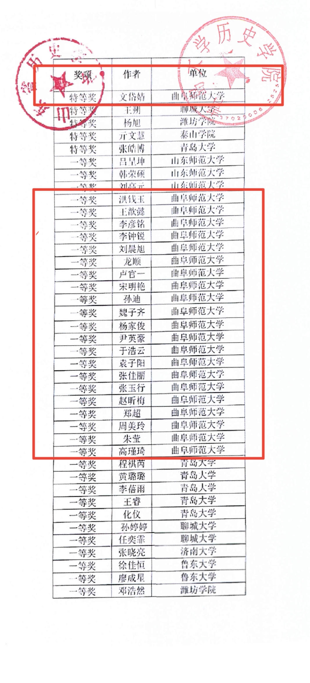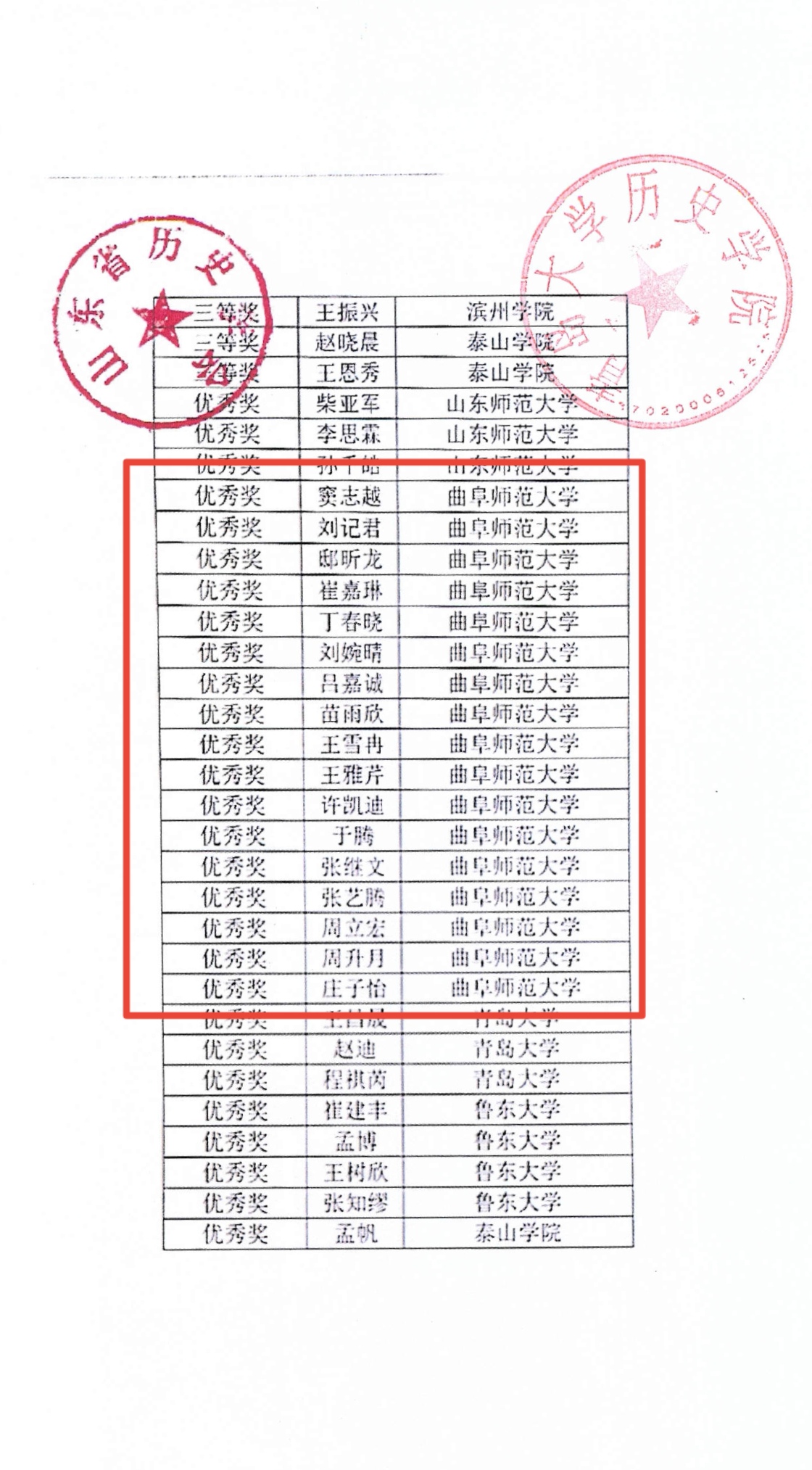 据悉,第二届山东省大学生历史征文大赛由山东省历史学会主办,青岛大学历史学院承办,以“中外历史”、“考古学”、“齐鲁历史文化”、“民俗文化”等为主题,面向驻鲁高校历史学专业本科生。本次大赛持续秉承提升历史专业大学生创新意识与研究能力的宗旨。参赛论文由山东省历史学会专家评审小组按照“质量优先,公平公开”的要求进行综合考虑,统一评审。