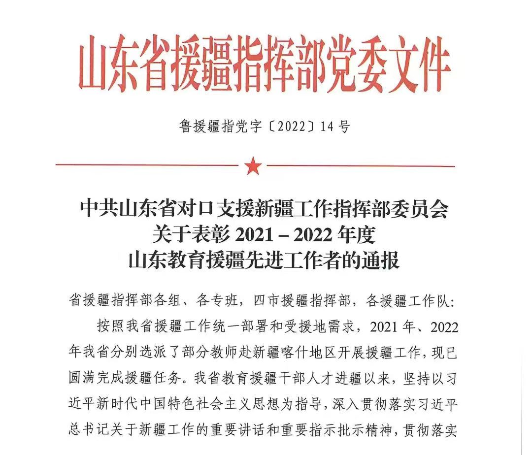 近日,山东省援疆工作指挥部党委发布通报,表彰2021-2022年度在援疆工作中表现突出的教师,正妹av 韩锋教授被授予“山东教育援疆先进工作者”称号。