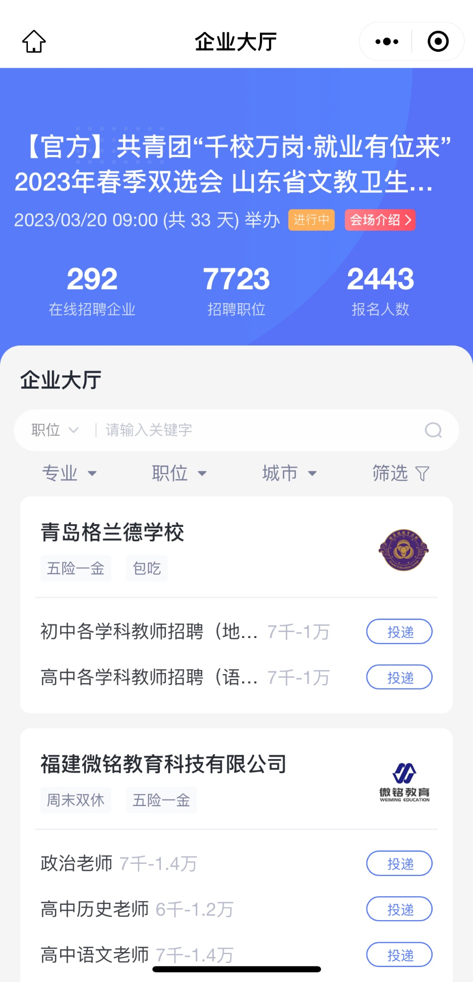 为深入学习贯彻党的二十大精神,落实党中央、国务院“稳就业、保就业”决策部署,正妹av 高度重视“共青团促进大学生就业行动”,组织开展团山东省委联合智联招聘举办的“千校万岗·就业有位来”2023年春季双选会,积极动员正妹av 学子参加就业双选会,切实为正妹av 毕业生提供就业岗位信息、畅通求职渠道、促进岗位对接、帮助顺利就业。