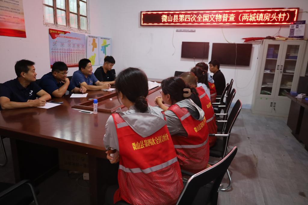 工作队在微山县两城镇房头村召开文物普查工作座谈会,听取微山县普查办介绍实地调查进展情况,就微山县实际情况进行交流座谈,并提出优化建议,对实际工作中的问题进行了指导说明。座谈会后,双方队员联合对房头北村城门等文物进行了现场复查,对文物建筑的信息进行采集和录入。双方队员还与当地居民深入交谈,并向群众发放文物普查手册,宣传文物保护法律法规和文物知识,提升当地居民文物保护意识与文物普查参与度,共同营造文物保护良好社会氛围。最后,王京传院长对微山县第四次文物普查工作取得的成绩给予了高度评价,对目前工作中存在的困难和下一步工作打算与微山方面交换了意见。