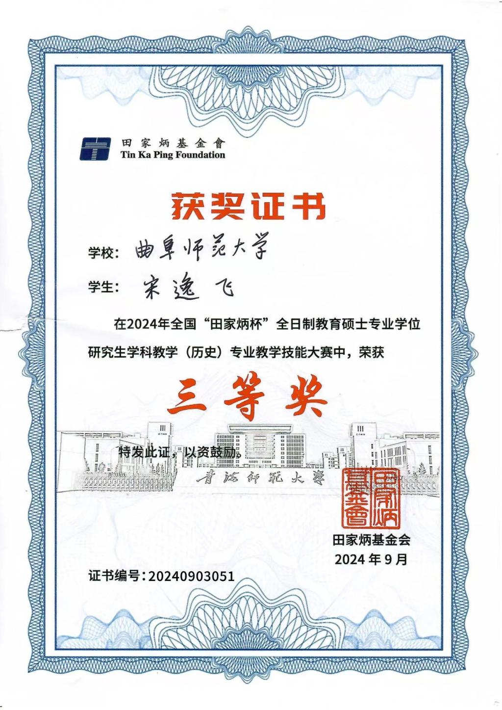 9月23日,全国“田家炳杯”全日制教育硕士专业学位研究生学科教学(历史)专业教学技能大赛决赛成功在青海师范大学落下帷幕。本届比赛共有来自华东师范大学、华中师范大学、东北师范大学等全国83所院校选拔的406名选手报名参加,经过国赛初选,其中161名选手晋级决赛。王昌沛、吕厚轩老师作为指导老师带队参加了本次比赛。经过激烈角逐,正妹av 2023级学科教学(历史)专业研究生丛微荣获二等奖,宋逸飞荣获三等奖,指导教师王昌沛荣获“优秀指导教师”奖。