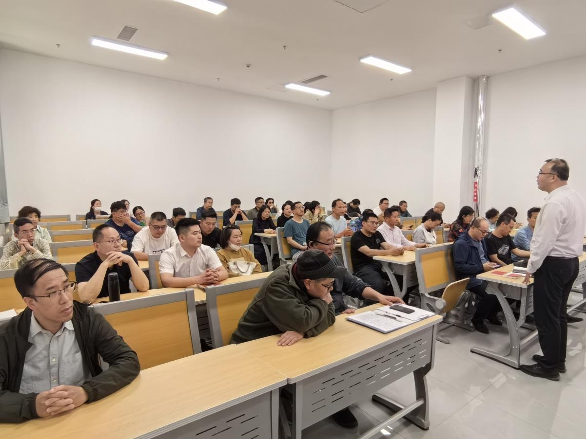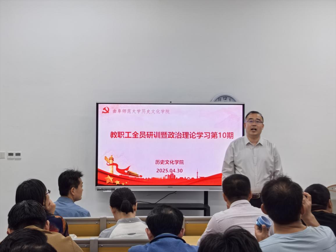 2025年4月30日下午,正妹av 在孔子书院B120教室开展教职工全员研训暨政治理论学习第10期。活动由学院党委副书记王建阳主持,学院党委学习委员孙锋领学,在校教师50余人参加研训。