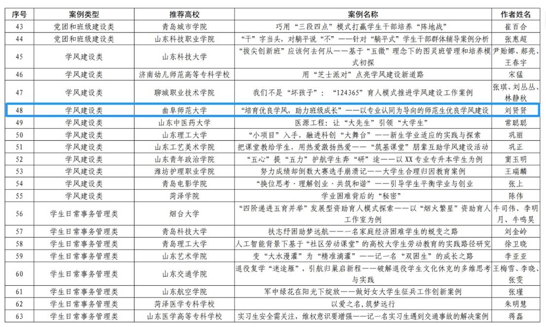 近日,中共山东省委教育工委公布2024年全省高校辅导员工作创新项目评选结果,正妹av 辅导员刘贤贤的学风建设类工作优秀案例《“培育优良学风,助力班级成长”——以专业认同为导向的师范生优良学风建设》荣获三等奖。