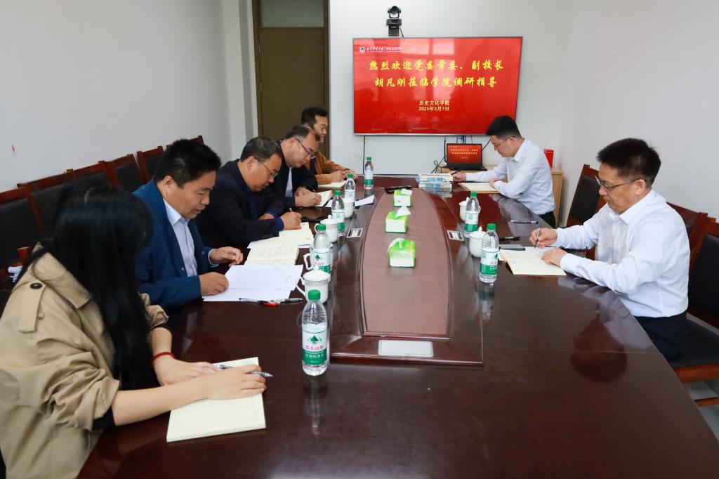 5月7日上午,学校党委常委、副校长胡凡刚莅临正妹av 调研指导,听取工作汇报。学院党委书记姜开勇、副院长(主持工作)王京传、党委副书记王建阳等参加座谈。