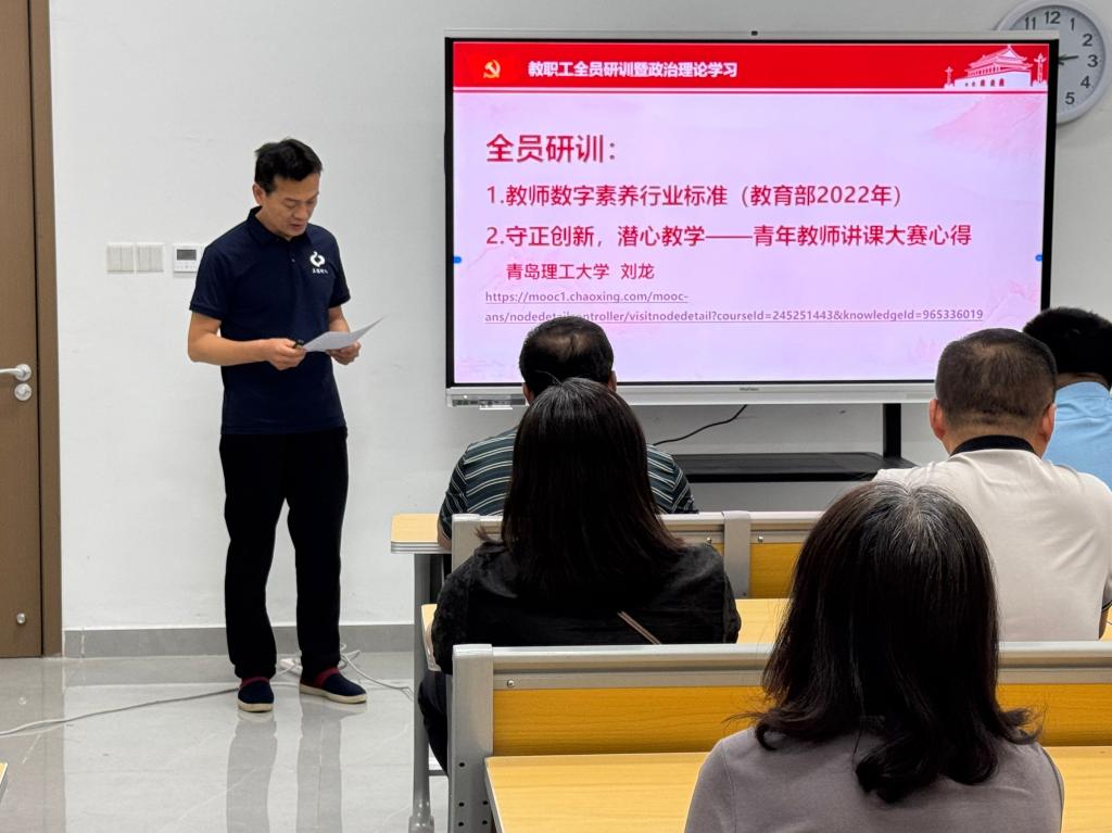 在随后进行的全员研训环节,全体教职工首先开展了以“坚守学术初心,弘扬求真精神”为主题的科研诚信教育,学习了《教育部关于加强高等学校科研诚信建设和学术不端治理的指导意见》《高等学校学术不端行为调查处理实施细则》《科研失信行为调查处理规则》等文件规定。全体教师还学习了教师数字素养行业标准(教育部2022年)。