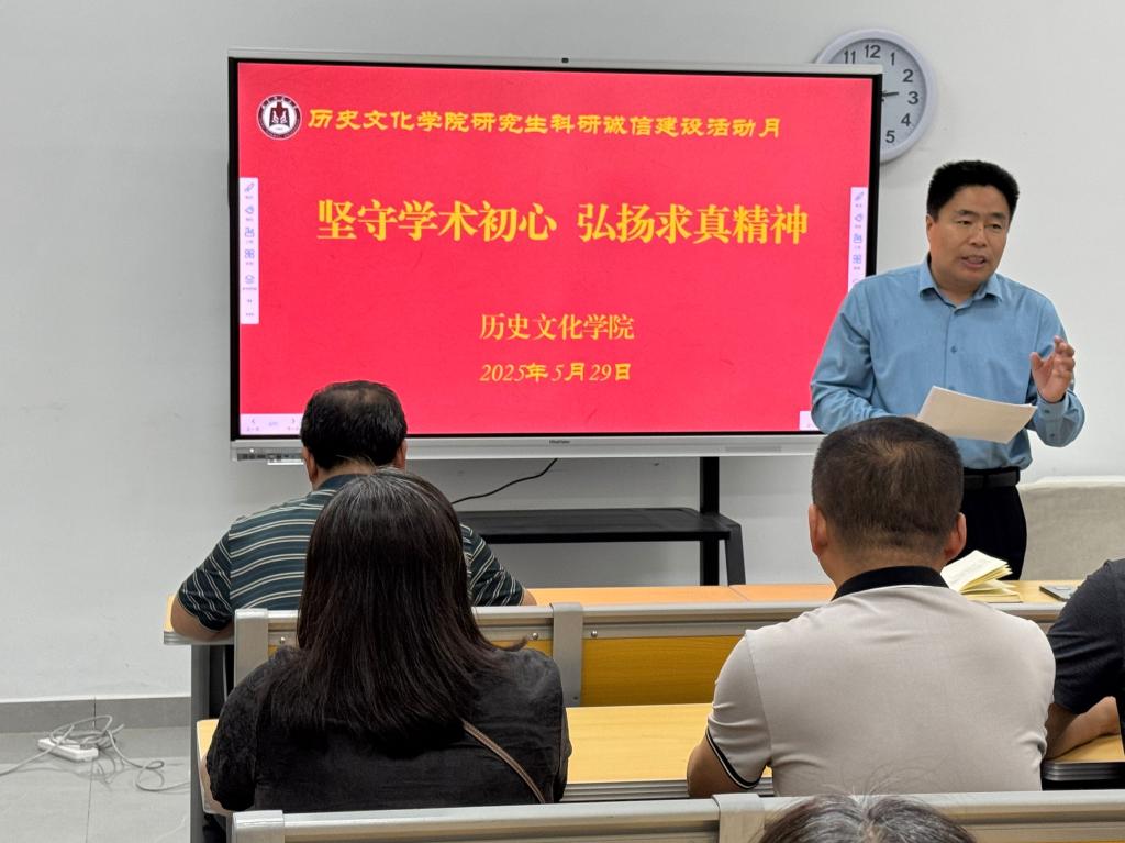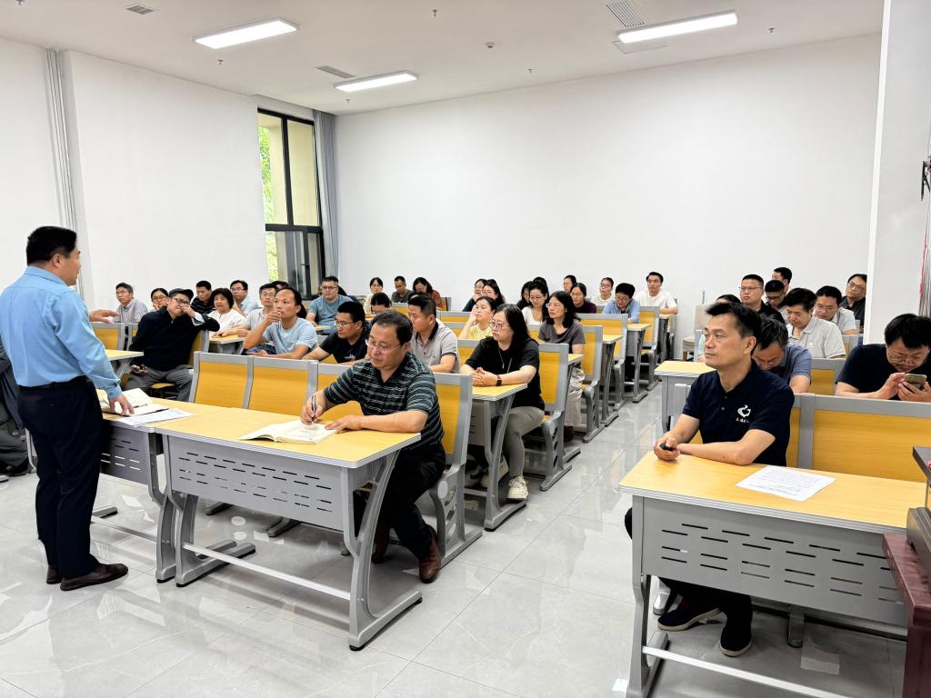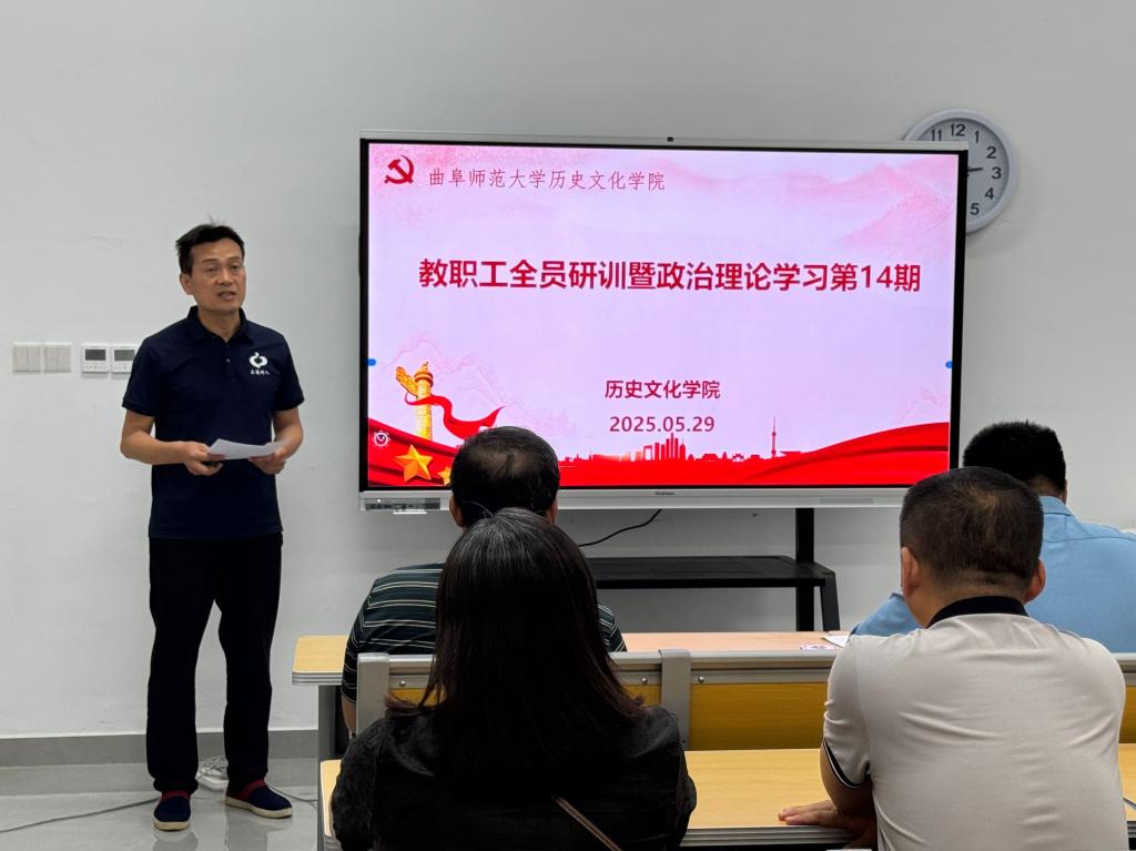 2025年5月29日下午,正妹av 在孔子书院B120教室举行教职工全员研训暨政治理论学习第14期活动。活动由学院副院长王京传主持,学院党委学习委员孙锋领学,在校教师近60人参加研训。
