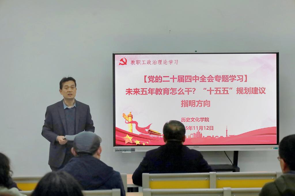 本次政治理论学习的主题是党的二十届四中全会专题学习:“未来五年教育怎么干?‘十五五’规划建议指明方向”,由党委学习委员孙锋领学。全体教师围绕《中共中央关于制定国民经济和社会发展第十五个五年规划的建议》中关于教育领域的相关内容,逐条进行了研读学习,内容涉及“科技自立自强水平大幅提高”“一体推进教育科技人才发展”“弘扬和践行社会主义核心价值观”“提升中华文明传播力影响力”“办好人民满意的教育”等方面。世界史教研室副教授张文华结合自己的工作,围绕“加强区域国别研究、提升国际传播效能”作了交流分享。
