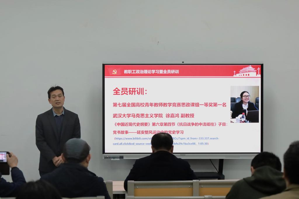 全员研训环节,全体教师集体观看了第七届全国高校青年教师教学竞赛思政课组一等奖第一名、武汉大学马克思主义学院徐嘉鸿副教授的参赛视频:《中国近现代史纲要》第6章第4讲子目《党书故事——延安整风运动中的党史学习》。视频展示了参赛教师扎实的理论功底、生动的教学设计和自然的课程思政融入,为正妹av 教师优化课堂教学、提升育人实效提供了宝贵借鉴。