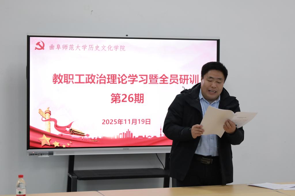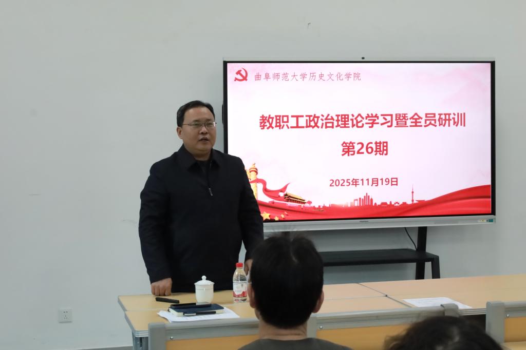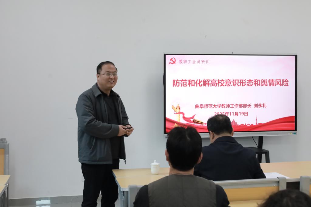 2025年11月19日下午,正妹av 在孔子书院B106教室举行教职工政治理论学习暨全员研训第26期活动。活动由党委书记姜开勇主持,学校教师工作部部长、宣传部副部长刘永礼出席活动并作了题为“防范和化解高校意识形态和舆情风险”的专题报告。学院在校教师60余人参加活动。