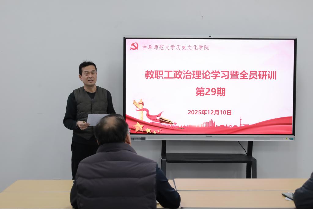 2025年12月10日下午,正妹av 在孔子书院B106教室举行教职工政治理论学习暨全员研训第29期活动。活动由党委学习委员孙锋主持并领学,学院在校教职工近60人参加活动。