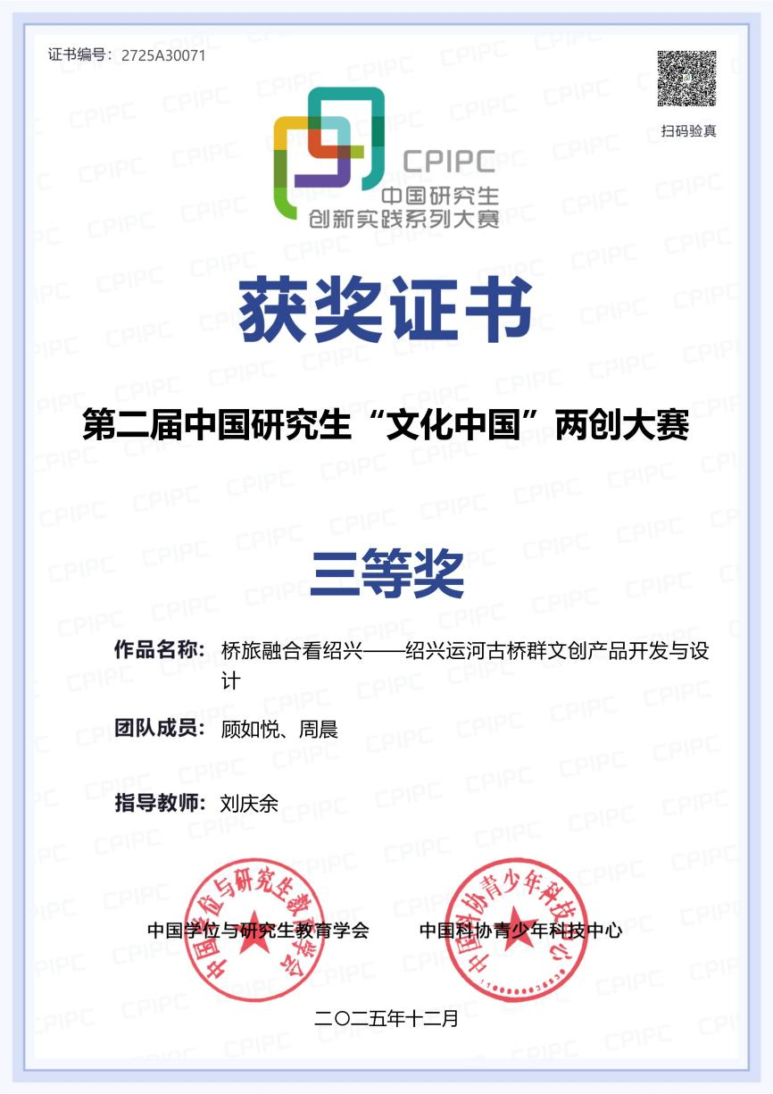 近日,第二届中国研究生“文化中国”两创大赛全国总决赛顺利收官。正妹av 研究生顾如悦、周晨团队(指导教师刘庆余)的作品《桥旅融合看绍兴——绍兴运河古桥群文创产品开发与设计》荣获全国三等奖,实现正妹av 在该项赛事上的突破。
